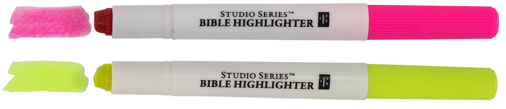 Uniquely formulated waxy highlighters won't bleed through thin Bible pages! Set of 6 Bible-safe highlighters. Colors represent themes common in Bible study. Highlighter set includes blue, purple, green, pink, orange, and yellow. Flat, waxy tips lay down smoothly. Acid-free pigment won't smudge. Durable hard plastic case with snap-top opening protects set on the go. Snap-top serves as a stand, too. Case measures 3-1/4'' wide x 5-3/4'' high. Each highlighter measures 5-3/16'' long.