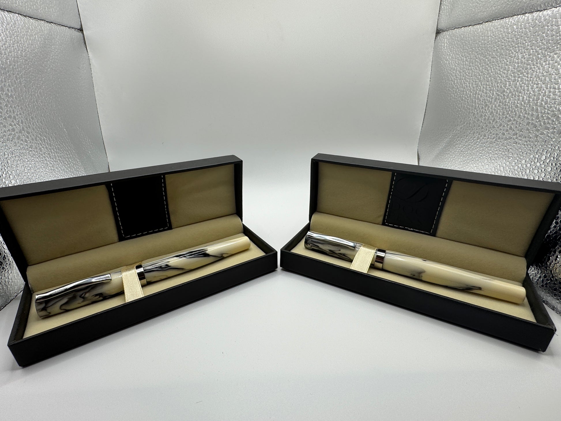 There are currently only 2 of these available. When these 2 sell, 2 more will be commissioned. Each one comes with a beautiful leather gift box, a Schmidt converter and a certificate of authenticity. And, for a limited time, your Écriture de L'âme pen purchase from our site includes free shipping and a free bottle of ink of your choice from our inventory of Anderillium or Monteverde USA inks!