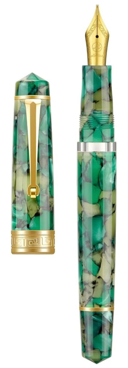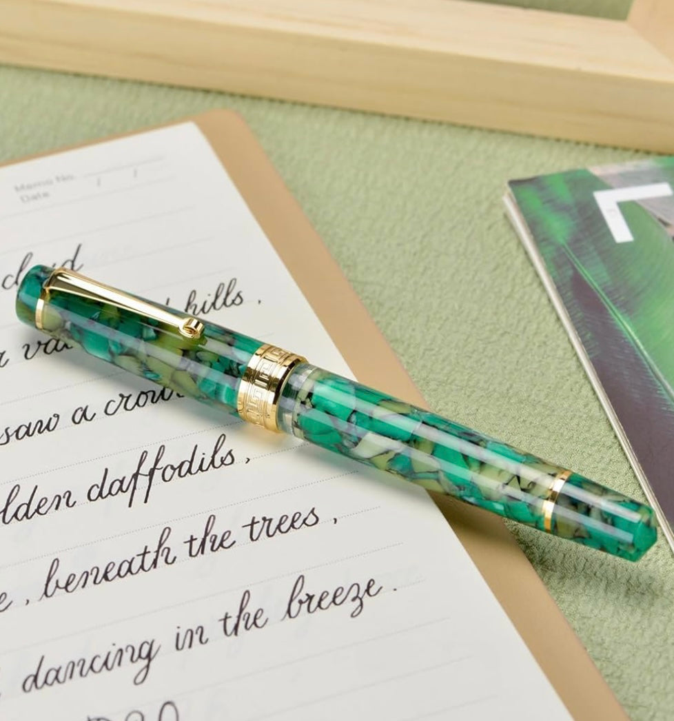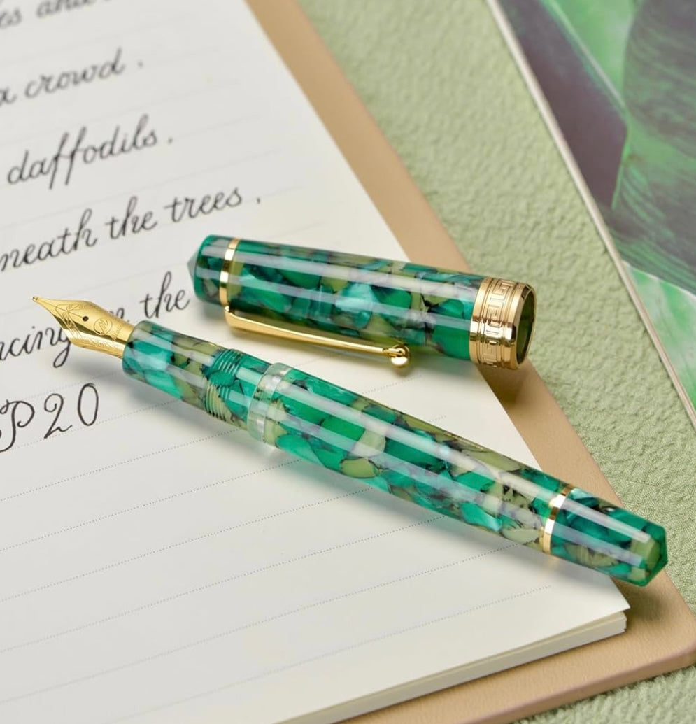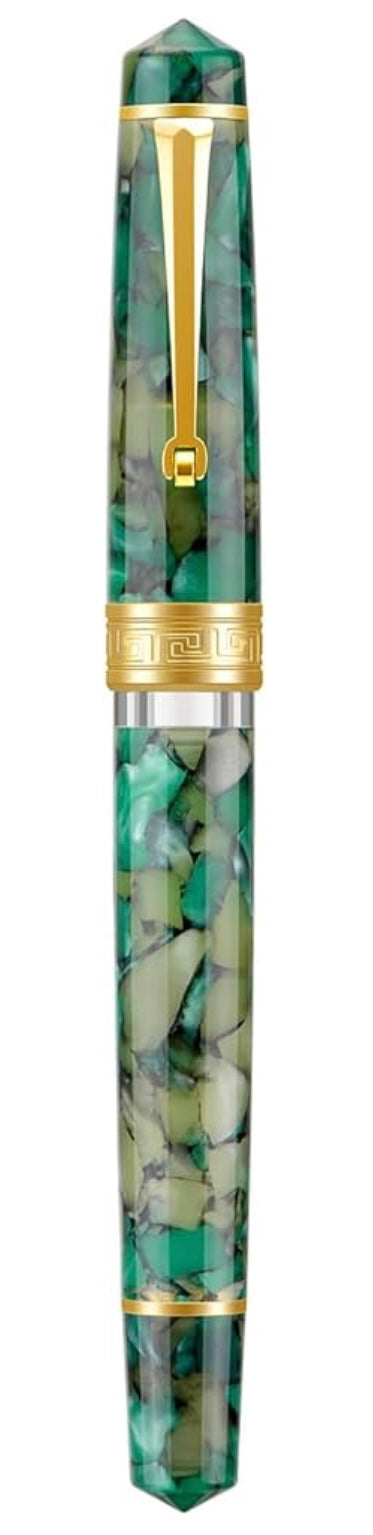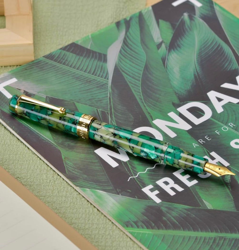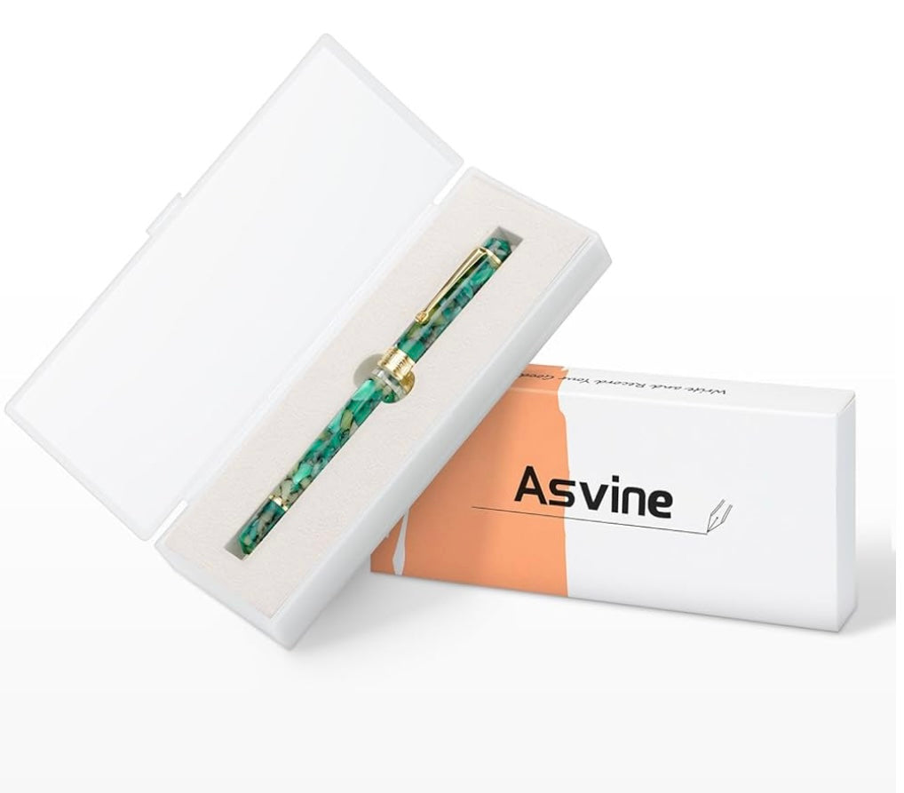 Asvine P20 Piston Fountain Pen Green Marble Acrylic, Medium Nib Gold Trim Smooth Writer Collection with Case Set