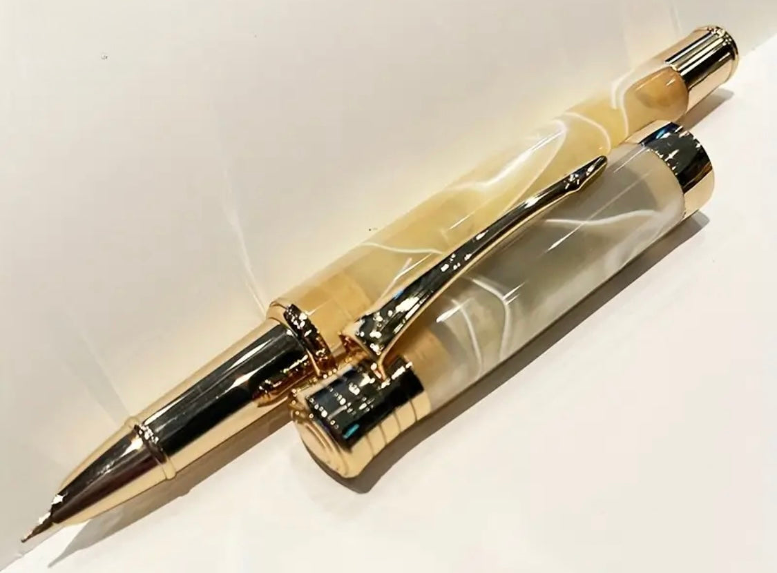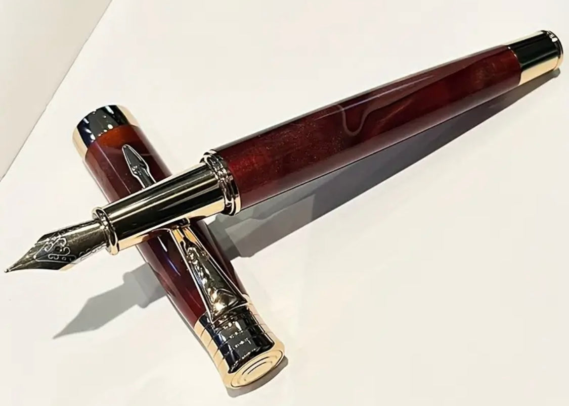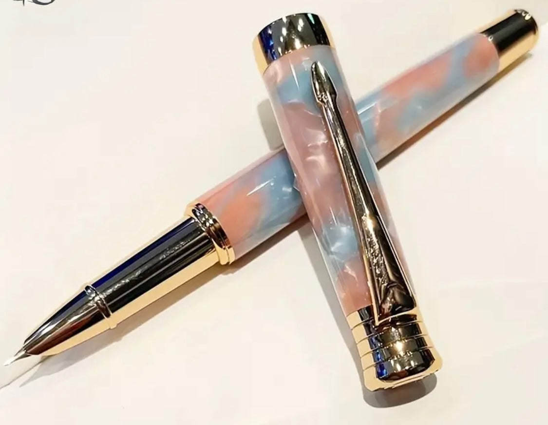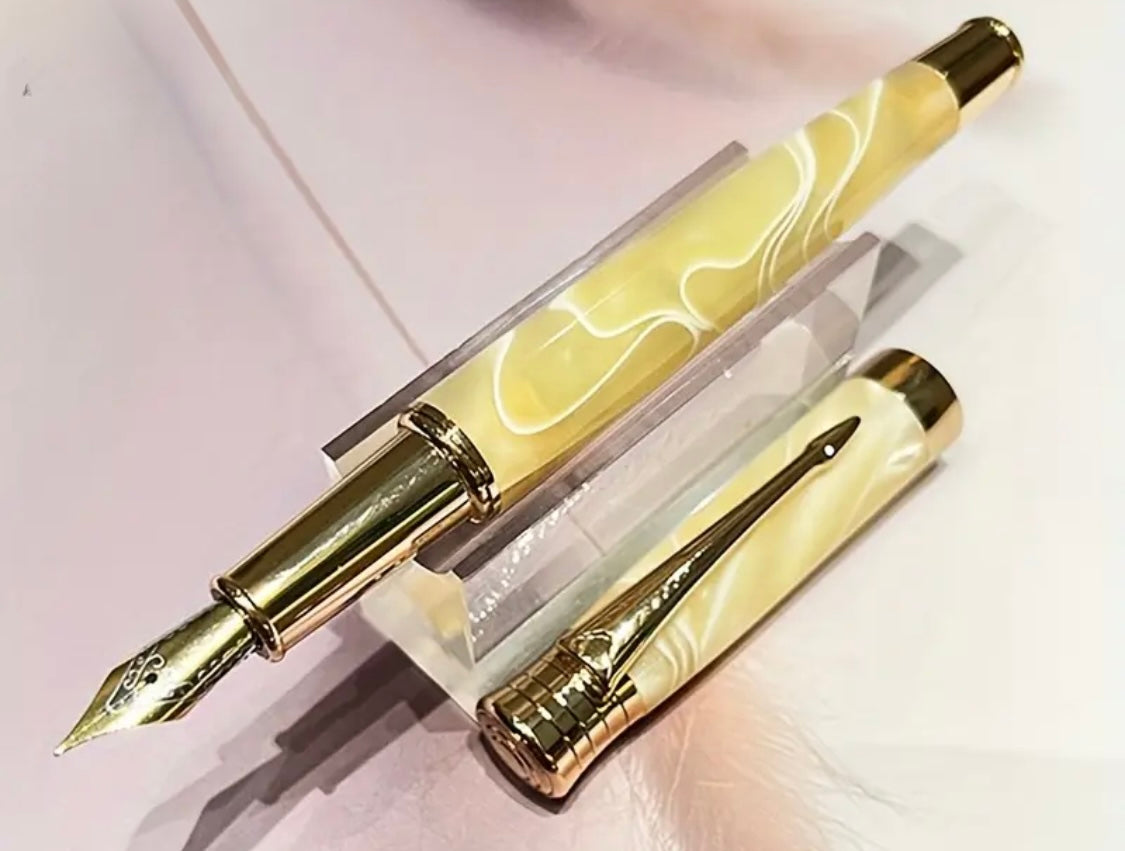 Beautiful resin pens with Fine nib and gold plates trip work. Feels like they should cost much more than they do. Comes with converter and gift box. Available in Beige/ivory, Amber and Pink.