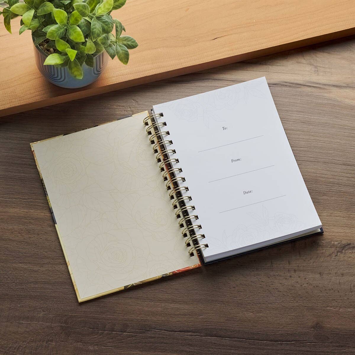 Yellow roses floral design, Navy blue background, White printed text, Be still and know, Psalm 46:10, Be Still Serene Roses Collection, Gold metal wire binding, Hardcover, Wirebound, 192 lined pages, Size: 8.4” x 6.4” x 1” (213 x 163 x 25mm)