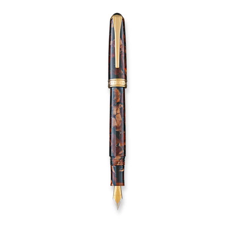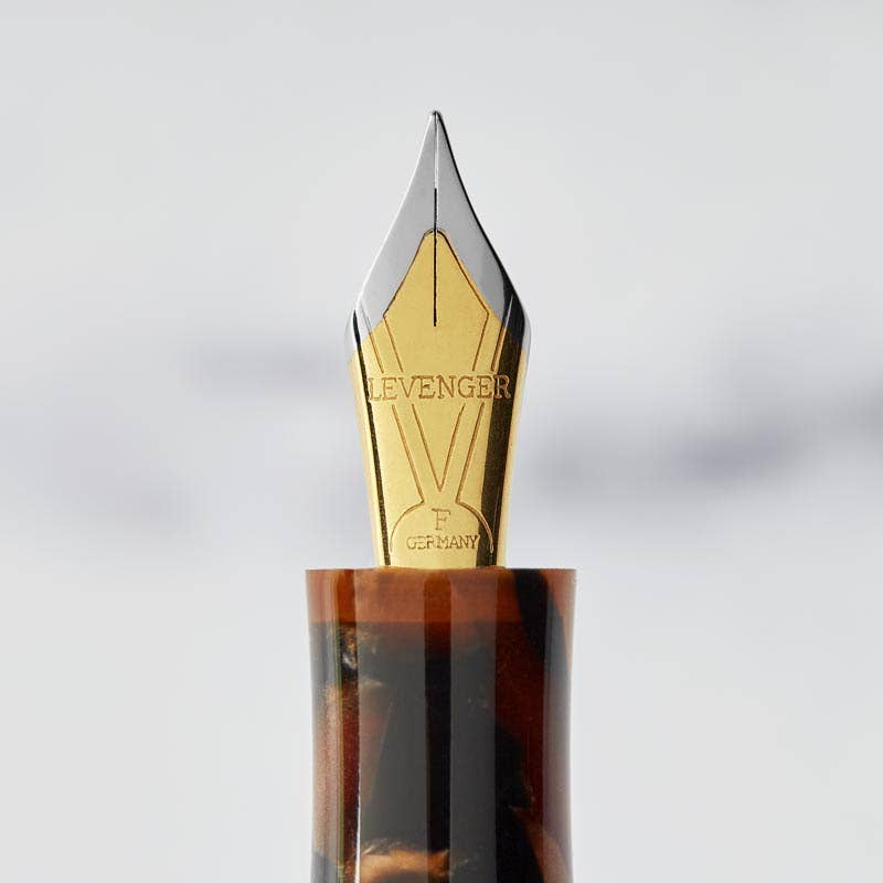 Our classic tortoise fountain pen, now decked out in gold. This dapper tortoise-shell pen design takes on a golden luster in the Golden Dark Tortoise Fountain Pen. The gold-plated trim and appointments gleam against the highly polished black, tawny brown and caramel resin barrel, combining understated professionalism with just a hint of luxuriant shimmer. This True Writer Classic fountain pen is perfectly weighted for an expressive writing experience and outfitted with a German-engineered, two-toned nib. Personalize with a monogram or full name.